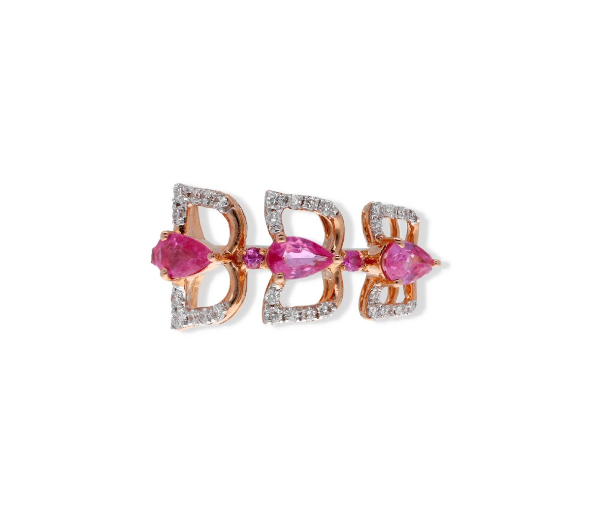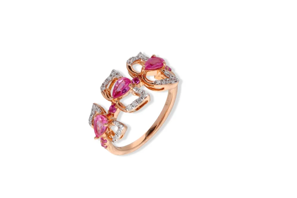 The Blossom Cascade Ring delicately intertwines diamonds and the enchanting hue of pink sapphires, creating a captivating cascade of blossoms. This ring is a harmonious blend of nature’s beauty and precious gemstones, radiating elegance and charm in every detail.