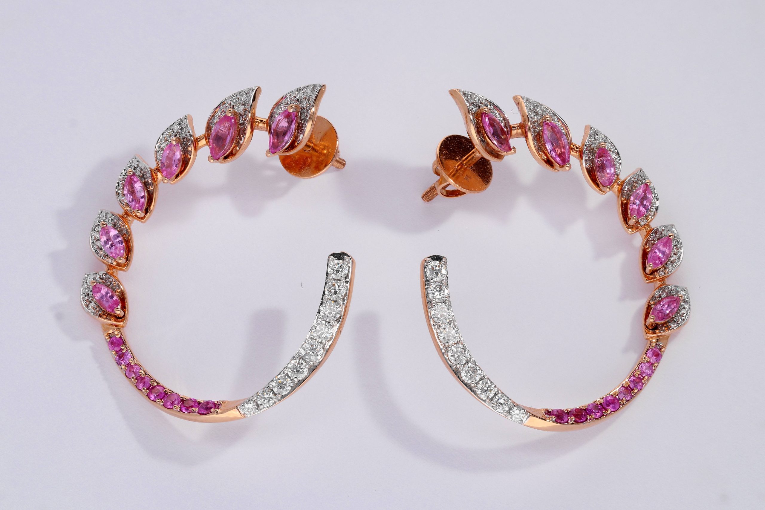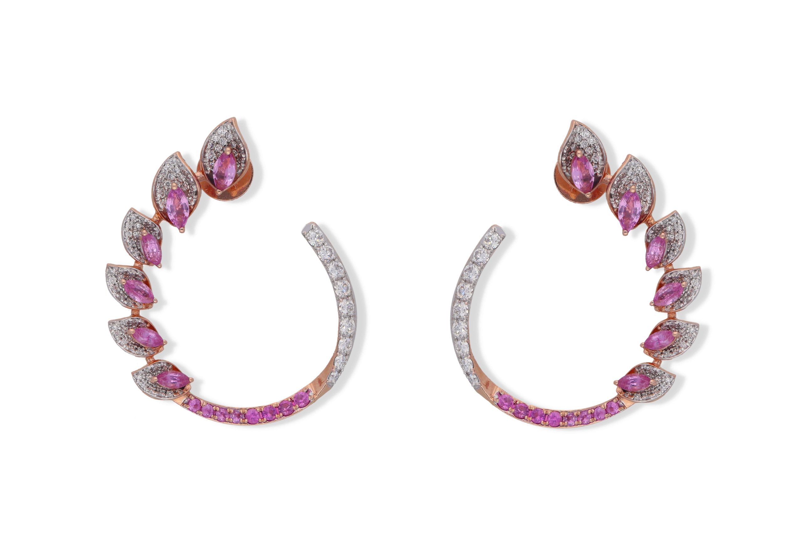 Floral Whispers Pink Sapphire Earrings gracefully capture the essence of delicate blooms adorned with the timeless beauty of pink sapphires and the added sparkle of diamonds, creating an enchanting and elegant accessory.